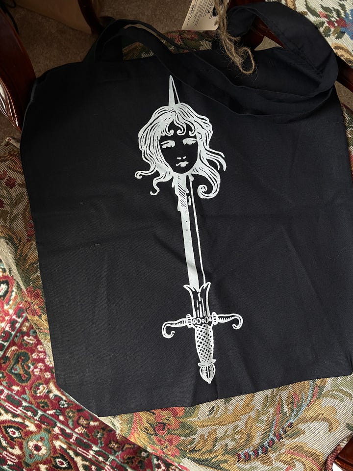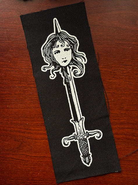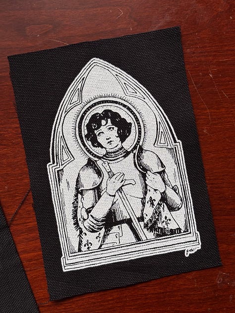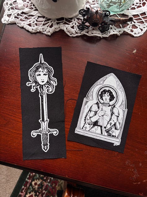 First, I’ve asked my friend Tyler, of Three Raccoons Studio, to make some screenprinted patches of two of my illustrations! I’m so in love with how these have turned out! I’ve got one patch of The Sword illustration, and one of Jeanne d’Arc. Both are on 100% cotton.